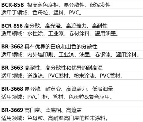 金红石氯化法钛白粉,具有优良的白度、高分散性、高光泽度、高遮盖力、高耐候性,以及蓝色相,低挥发性、低吸油量、优异的耐黄变性,良好的加工流变性等特征。可广泛应用于水性涂料、工业漆、卷材涂料、罐用油墨、木器漆和油墨等行业领域。