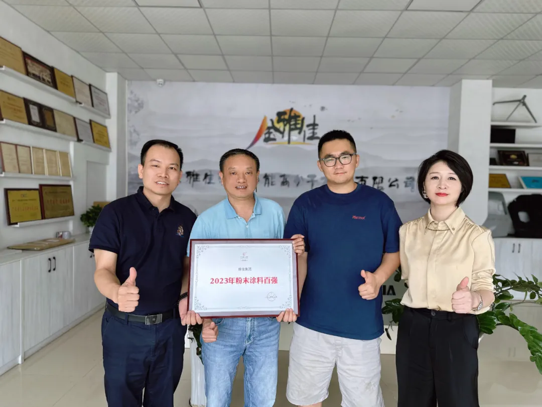 涂料采购网张馨元(右)到访雅佳并颁发粉末销量百强及粉末销售额50强奖牌