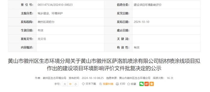 近日,黄山市徽州区生态环境分局发布关于黄山市徽州区萨洛凯喷涂有限公司铝材喷涂线项目拟作出的建设项目环境影响评价文件批复决定的公示。