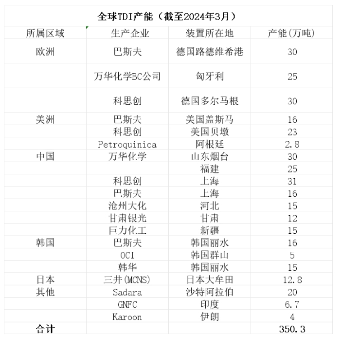 海外TDI装置纷纷关停,全球产能向我国集中。其中,巴斯夫已于2023年初关闭了其路德维希港基地的TDI及其前体装置;日本东曹也于去年停止了其位于日本Nanyo的TDI生产。我国成为全球TDI主要供应地,产能占全球总产能的近40%,国内现有产能情况如下(截至2024年8月):
