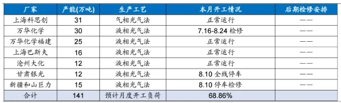 其中,甘肃银光TDI装置已结束单线运行状态,逐步恢复双线运行;韩国韩华3条TDI生产线将于10月15全部停车至月底;上海科思创TDI装置11月装置例行一周停车检修;美国一套装置10月份已经停车进入年度大检。