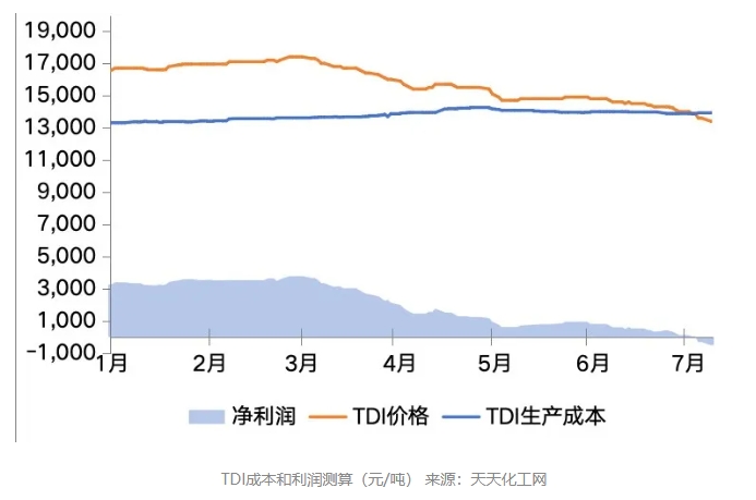 就拿今年1月以来的情况看,在原料成本居高不下、TDI价格快速下跌,再加上需求低迷,3月份以来TDI行业平均净利润大幅下跌。据估算,7月份TDI净利润跌至-500/元左右,多数TDI生产企业净利润已经开始亏损。