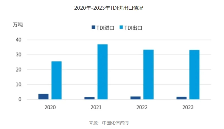 亚洲是全球TDI出口的最主要区域,其中我国贸易量占比达83%,2023年,我国TDI出口达33.3万吨,同比小幅下降0.5%。