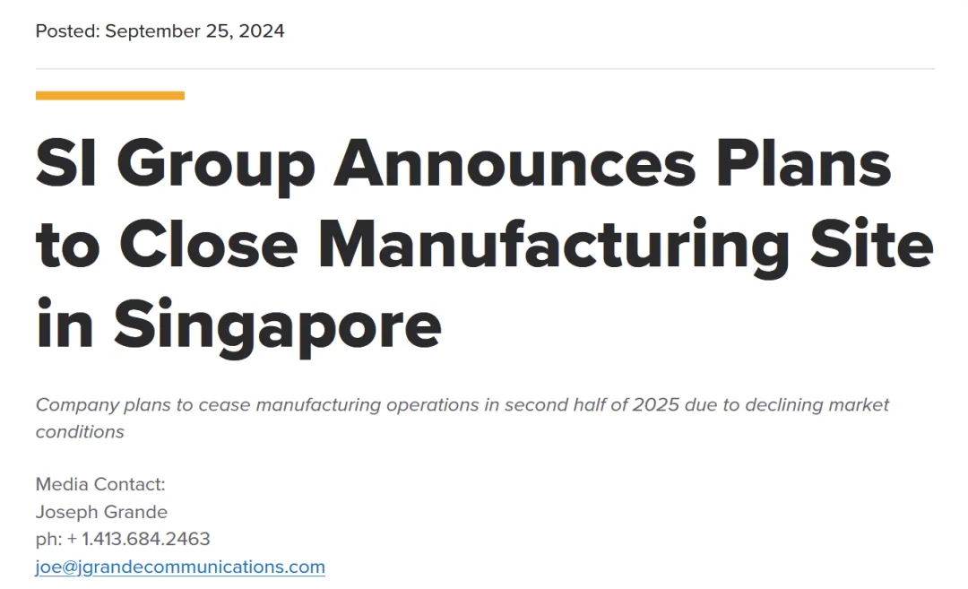 美国高性能添加剂、化学中间体企业圣莱科特国际集团(SI Group)宣布,计划于2025年下半年关闭其在新加坡裕廊岛的烷基酚制造工厂。