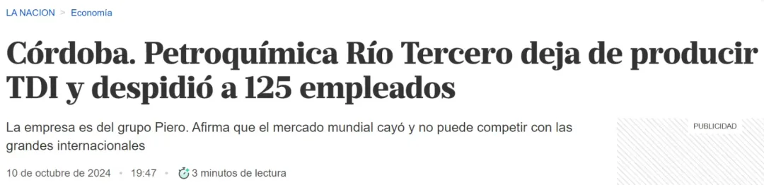 阿根廷Petroquímica Río Tercero公司决定于10月14日起关停其位于科尔多瓦的甲苯二异氰酸酯 (TDI) 工厂,并表示将解雇125名员工。