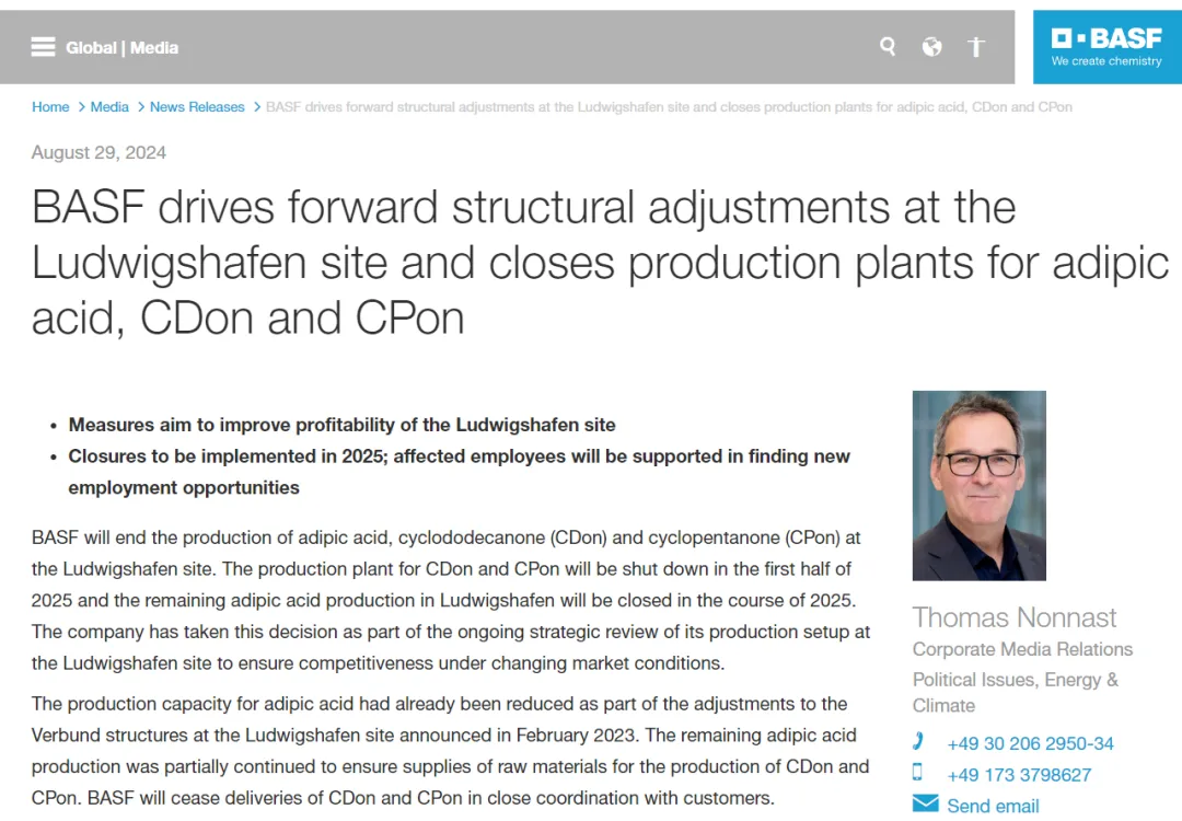 巴斯夫宣布将关闭德国路德维希港生产基地生产己二酸、环十二酮(CDon)和环戊酮(CPon)的三家工厂。CDon和CPon生产工厂将于2025年上半年关闭,路德维希港一体化基地剩余的己二酸生产将于2025年关闭。