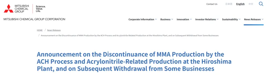 三菱化学集团将关停旗下广岛工厂的ACH工艺甲基丙烯酸甲酯(MMA)单体、丙烯腈及其衍生物(涉及螯合剂、乙腈和硫酸铵)产能,并撤销螯合剂和乙腈业务。