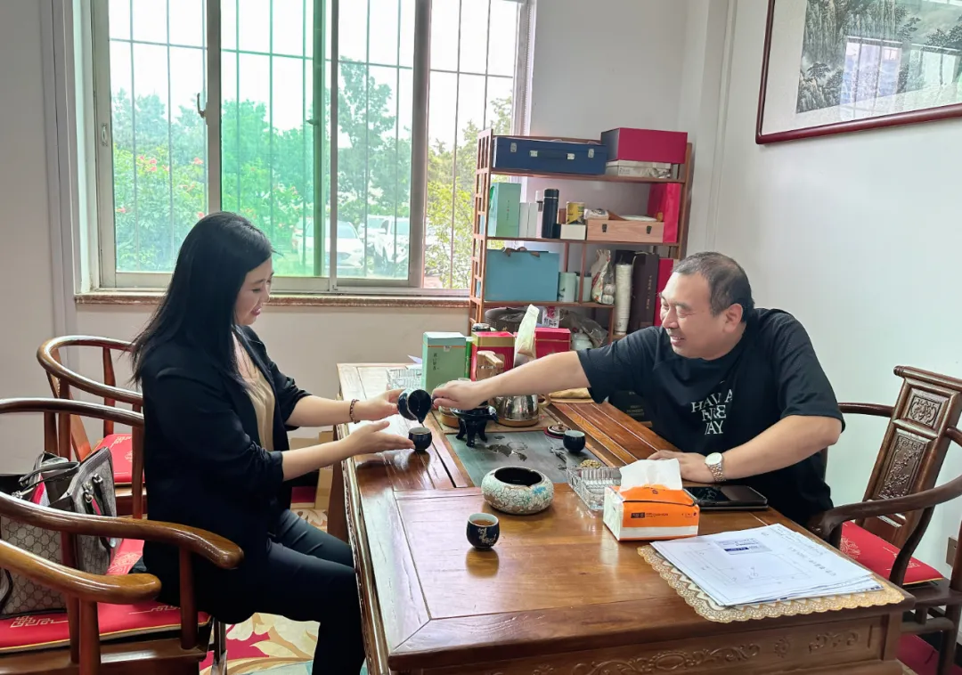 涂料采购网王赛(左)到访烟台欧冠,并与王总(右)沟通行情