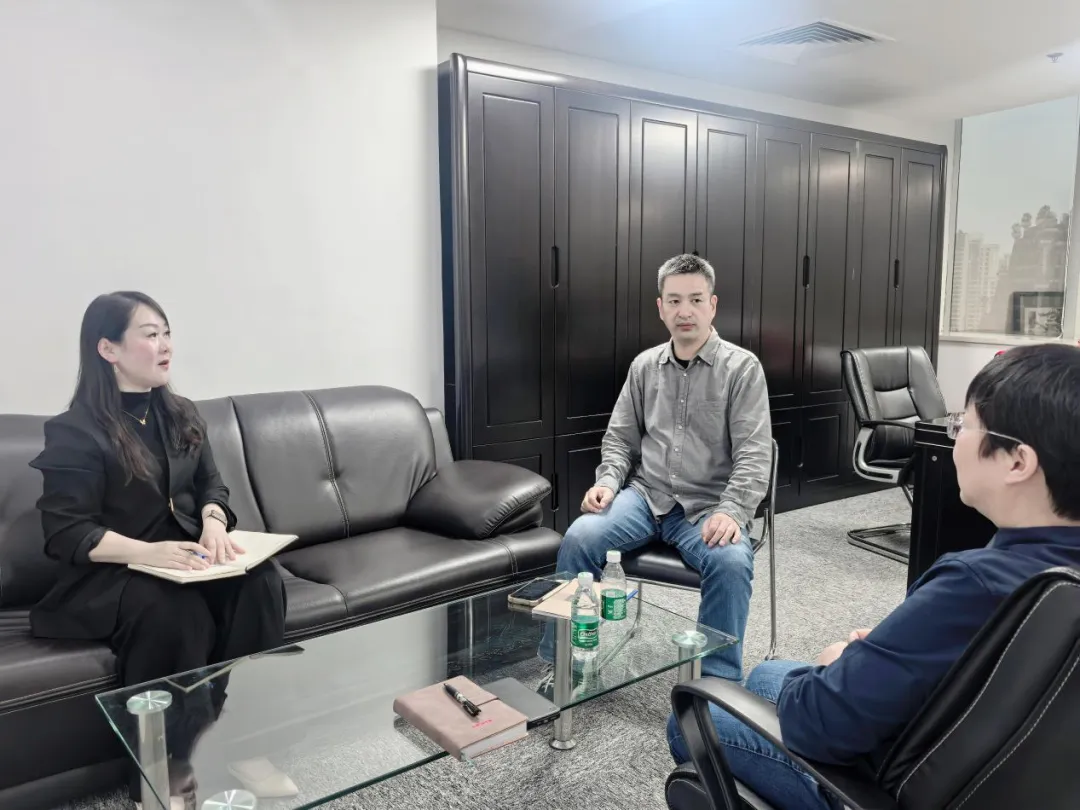 涂料采购网江雪(左)与壹维机董事长谢红辉(右)、副总经理王海龙(中)现场交流