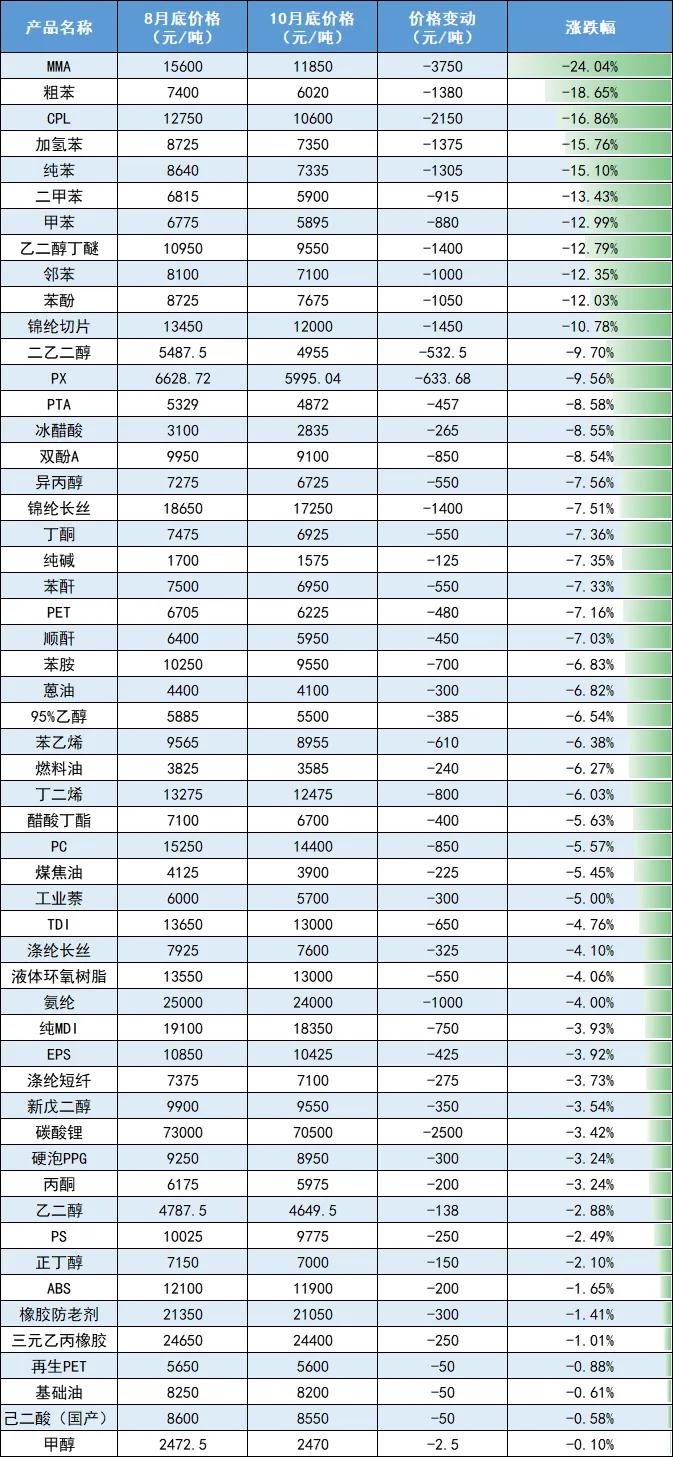 涂料采购网统计了10月底众多化工品的价格,发现50多种产品比8月底出现下滑趋势,最高下跌3750元/吨。其中MMA价格下滑超过20%,粗苯、纯苯、甲苯等价格下跌超10%,与涂料行业息息相关的PTA、双酚A、异丙醇、丁酮、醋酸丁酯、TDI、MDI、新戊二醇等原材料也出现了个位数左右的跌幅。