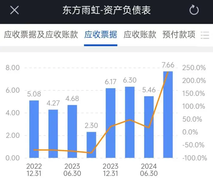 除此之外,东方雨虹提到,减值损失计提同比增加也是净利润下滑的原因。而减值损失计提的关联内容就是应收款项以及坏账计提等。东方雨虹三季报数据显示,尽管应收账款为114.41亿,已经同比下滑了25.36%,但占营业收入的比例却高达52%,背后风险重重。与此同时,应收票据高达7.66亿,同比增加了233.80%,是2022年年末以来的单季度最高值。