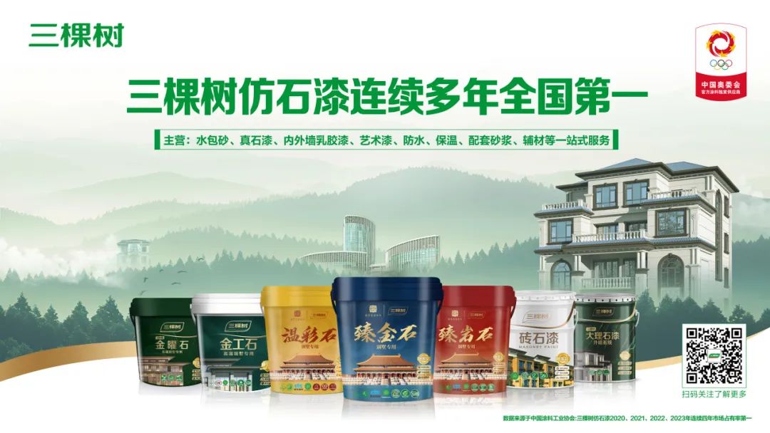 作为涂料民族品牌,三棵树坚持创新研发作为企业发展的源动力,响应国家绿色低碳转型号召,研发推出性能优越、装饰性强、施工便捷的工程艺术漆等产品,实现建筑工程涂装美学新创意。2022年起,三棵树连续多年摘得工程建筑涂料销量桂冠。世界权威市场调查机构发布行业重要市场洞察显示,三棵树稳居建筑工程涂料全国第一。