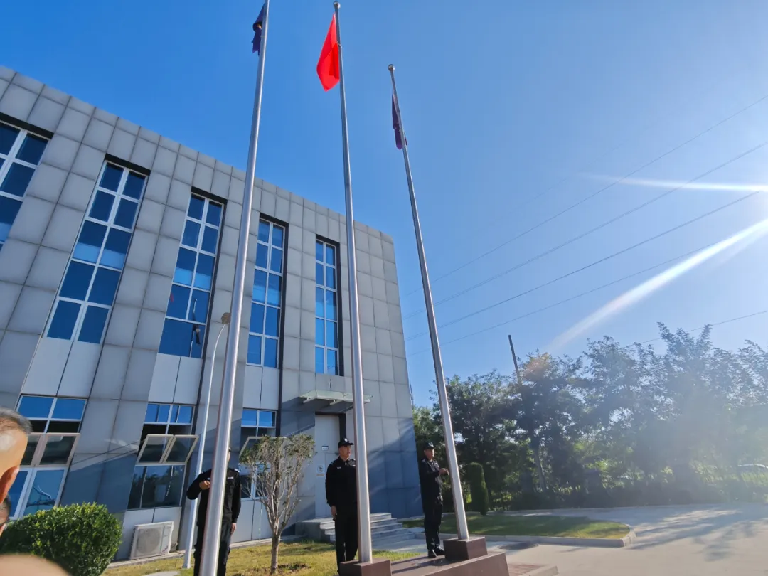 蓝天如洗,白云悠扬,随着国歌声响起,护旗手将鲜艳的五星红旗缓缓升起至旗杆顶端,迎风飘扬。随后,展辰旗帜缓缓升起,为30周年仪式增添了浓厚的氛围。