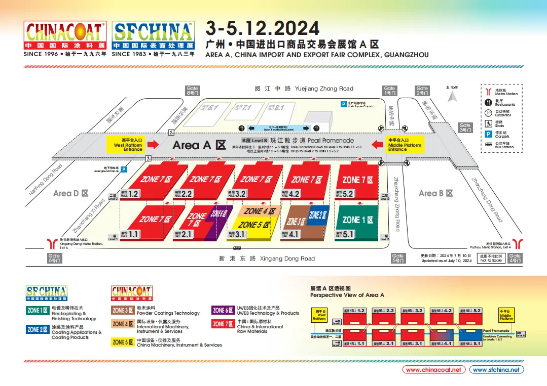 2024年Chinacoat涂料展将覆盖8.5个展馆(1.1、2.1、3.1、4.1、1.2、2.2、3.2、4.2及 5.2 展馆),总展出面积超过91.500平方米,汇聚来自30个国家和地区超过1.300家参展商,分为5大展区(「中国 + 国际原材料」、「中国设备、仪器及服务」、「国际设备、仪器及服务」、「UV / EB 固化技术及产品」和「伟德客户端官网」)向全球观众展示其崭新并满足下游产业发展需求的产品和技术。展会同期举行一系列技术交流活动,提供与同行以及上下游交流、学习新知识、探索行业发展潜力的良机。