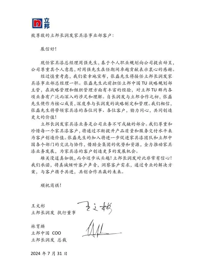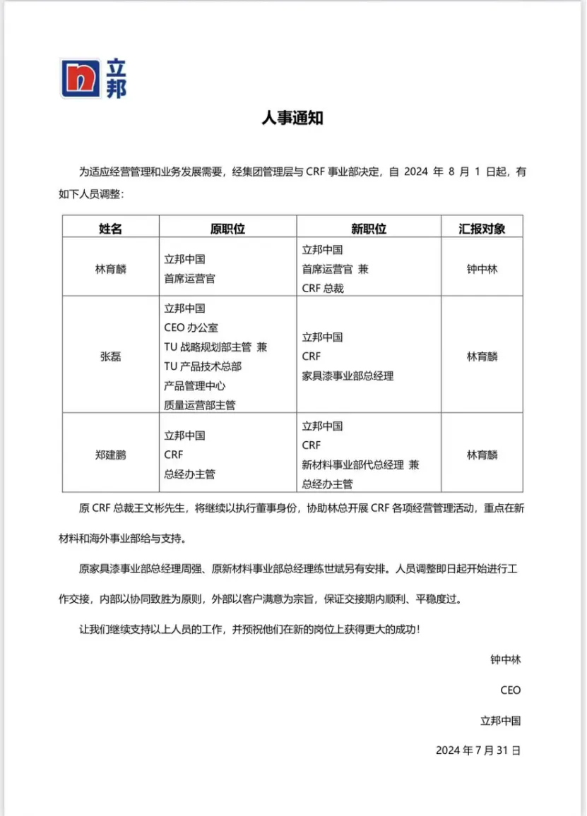 立邦中国宣布了一系列高层的人事变动,首席运营官林育麟被任命为立邦中国首席运营官兼CRF总裁;张磊晋升为立邦中国CRF家具漆事业部总经理,CRF总经办主管郑建鹏新职位是立邦中国CRF新材料事业部总经理兼总经办主管。