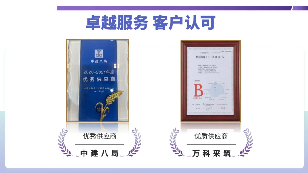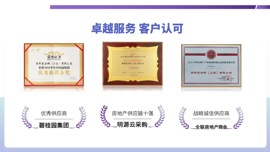 紫荆花作为深耕涂料领域40余年的民族品牌,拥有涵盖内外墙涂料、地坪涂料、木器涂料、艺术涂料、无机涂料、防火涂料、防腐涂料、大坝、风电等特种涂料、防水材料、辅材等全体系产品,拥有德国蓝天使、美国FDA、美国CPC、美国USDA生物基认证、美国绿色卫士金级认证、法国A+、日本JIS、中国绿色建材产品认证、中国环境标志产品认证等多项国内外权威认证,拥有国家级绿色工厂、CNAS国家认可实验室等一系列品牌硬核实力,可为客户提供全面、系统、专业的全场景涂装解决方案,紫荆花优质完备的产品体系、高效的供应保障、专业的服务能力受到了战略合作客户的广泛认可和好评。