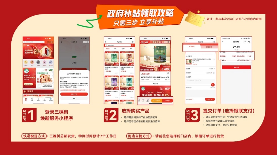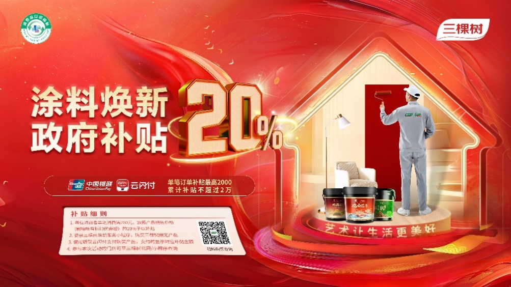 “三棵树 马上住 更健康的中国漆”,三棵树顺应消费市场发展趋势,积极参与政府补贴政策,提供健康高品质的艺术涂料产品,并配套专业涂刷服务,不断满足人们对高品质理想生活的追求,实现“住有所居”到“住有优居”的品质升级。在政府利好政策的强力支撑下,三棵树将全力支持各项焕新补贴活动精准落地,让每一位选择三棵树的家庭都能享受到实实在在的品质生活。