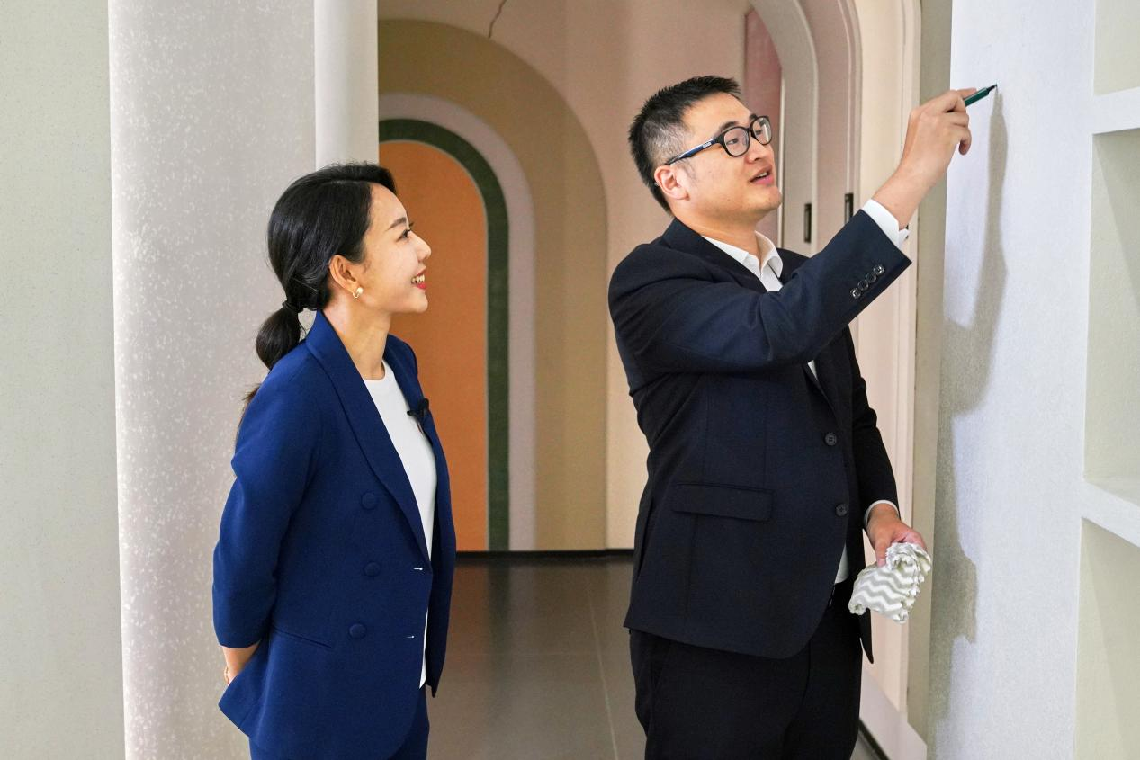 三棵树副总裁洪圣源(右)向记者展示艺术漆墙面的可擦洗性
