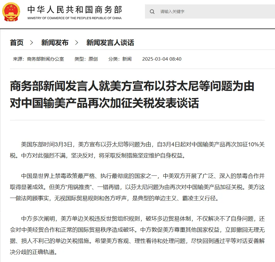 2025年3月3日,白宫鉴于芬太尼供应链管控问题,将对中国加收关税从10%提升至20%,自3月4日起生效,针对全品类。