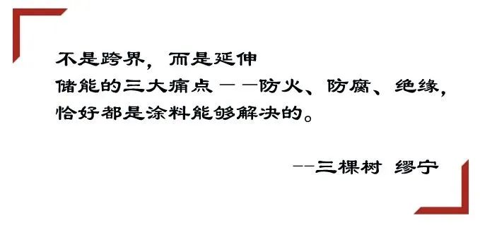 很多人问三棵树为什么能跨界储能、新能源领域,缪宁笑着说,"其实不是跨界,而是延伸。储能的三大痛点——防火、防腐、绝缘,恰好都是涂料能够解决的。"