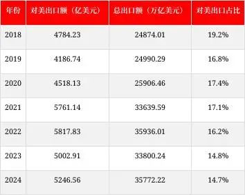 从2018年到2024年,中国对美出口占总出口的比例从19.2%下降到14.7%,这一变化主要受到中美贸易摩擦、美国加征关税以及中国积极拓展其他海外市场等因素的影响。从2024年的数据来看,品类主要是工业化制造品,其中高附加值产品迅速增长,而传统的家居、玩具等占比较低,且比例持续缩小。