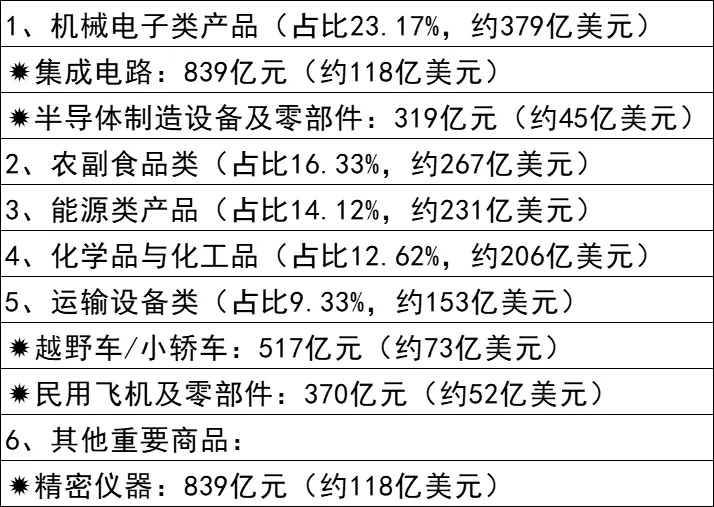 中国从美国进口的商品结构也较为多元,2024年中国对美国进口了总价值11640亿元人民币(折合约1435亿美元)的商品。农产品、能源、机械电子为三大核心进口领域。