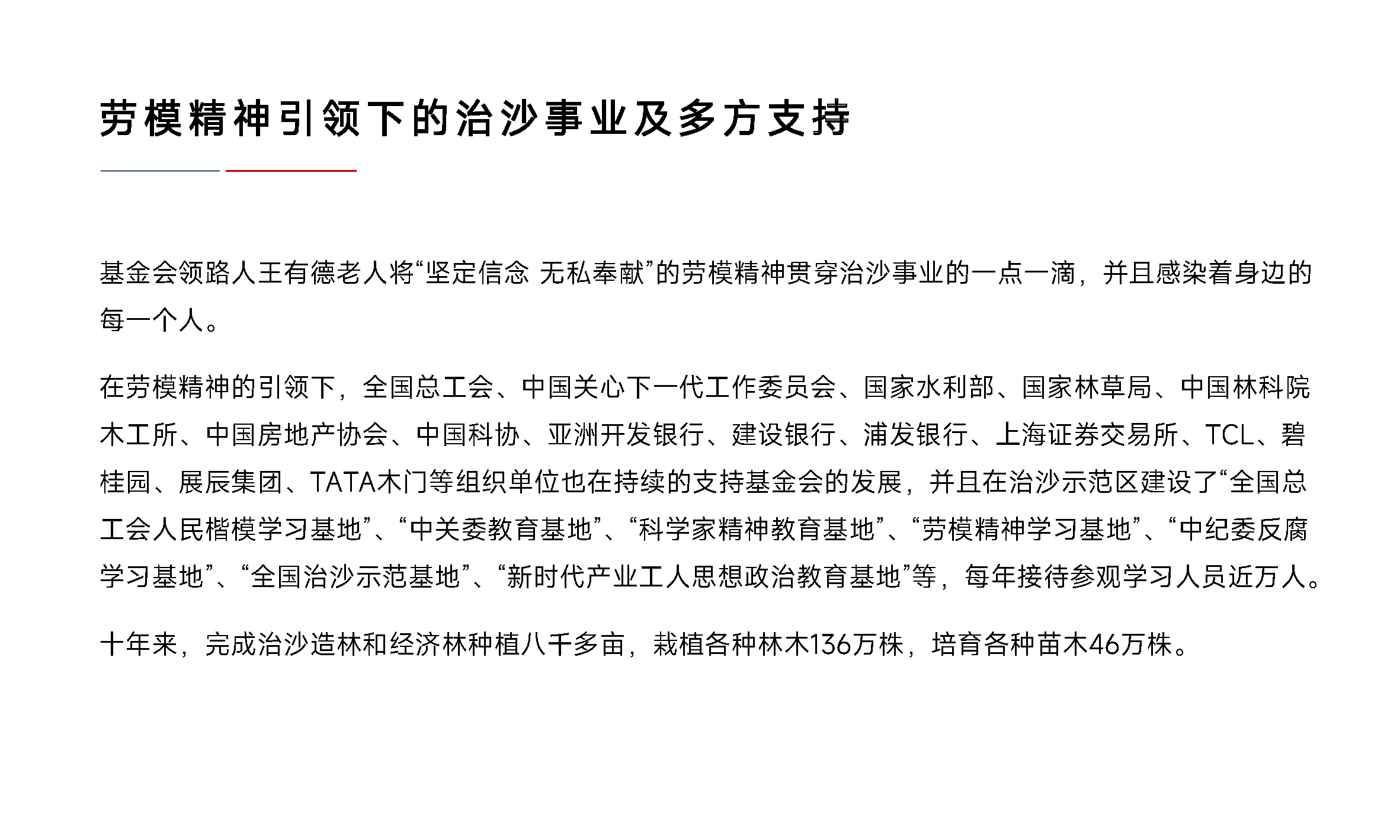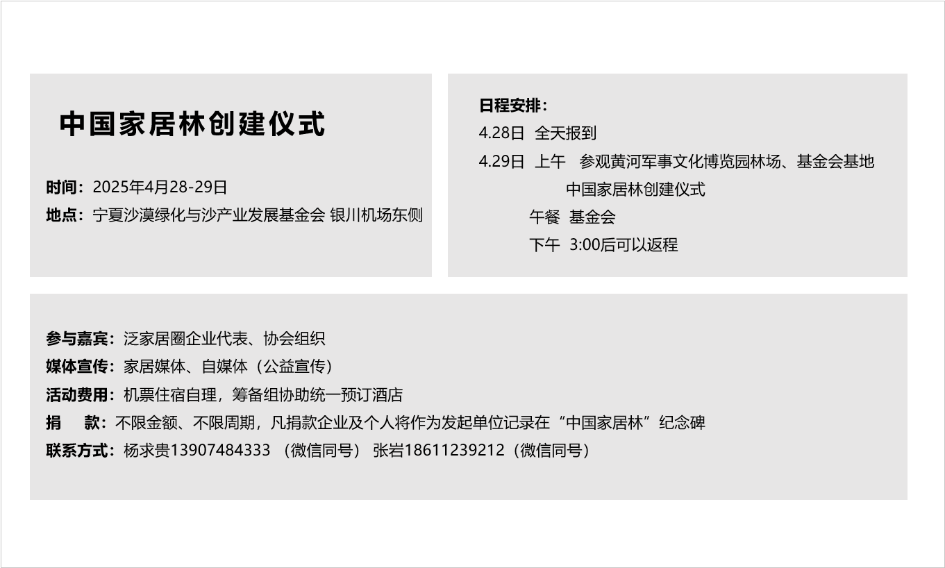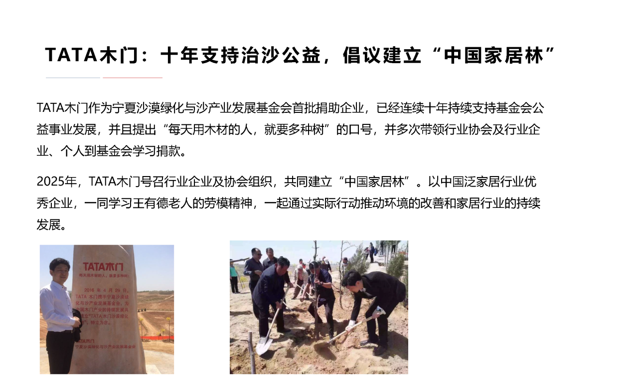 “中国家居林”创建不仅是一次公益实践,更是一场绿色革命的起点。展辰呼吁更多家居企业加入这场“逐沙”行动,与TATA木门、科宝·博洛尼等伙伴同行,将绿色责任融入生产、设计与服务,让每件家居作品都承载生态使命。携手种下“中国家居林”,不仅是对自然的回馈,更是对消费者、对行业、对未来的郑重承诺。让我们以木为媒,以林为证,共筑人与自然和谐共生的美好家园!