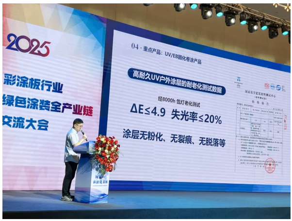 在产品应用与开发部分,他主要介绍了超高耐候树脂和高耐久UV户外涂层两款重点产品:超高耐候树脂7050拥有超强耐候性能,3000小时氙灯照射失光率仅为2.6%;高耐久UV户外涂层经8000小时氙灯老化测试,结果显示∆E≤4.9.失光率≤20%,涂层无粉化、无裂痕、无脱落等现象。