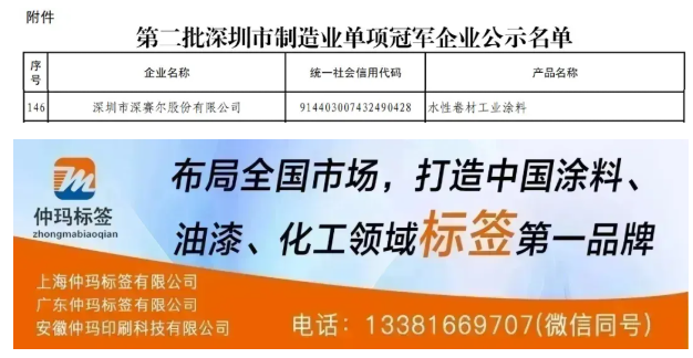 近日,深圳市工业和信息化局组织遴选的第二批深圳市制造业单项冠军企业名单揭晓,深圳市深赛尔股份有限公司凭借在水性卷材工业涂料领域的市场占有率及行业影响力,正式入选深圳市制造业单项冠军名单,同时也是本次唯一入选的涂料企业。