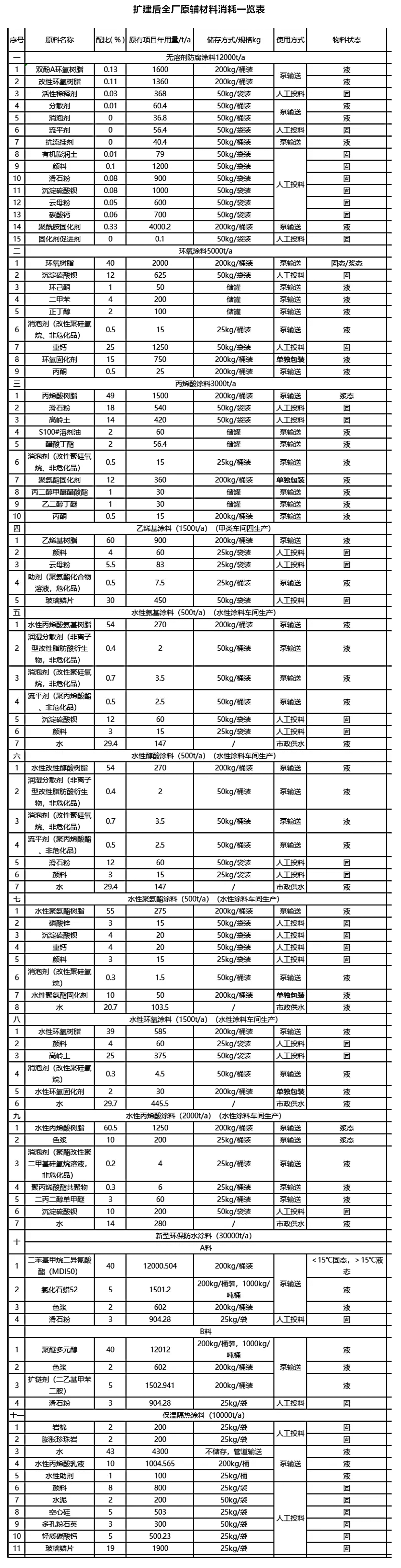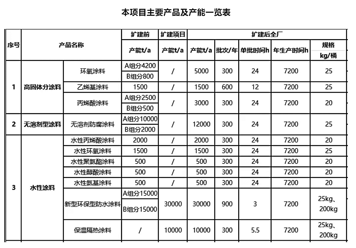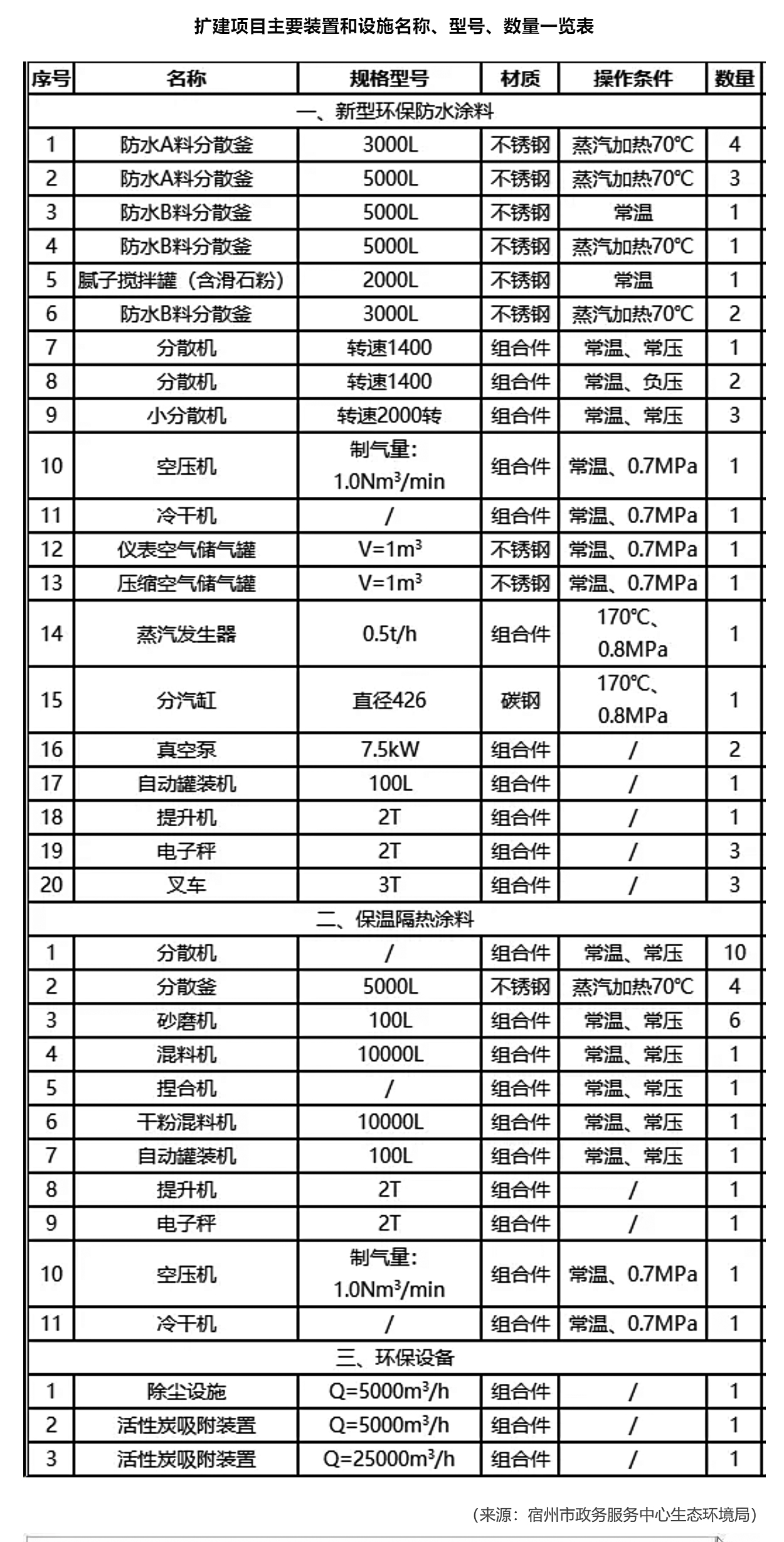 两条生产线,形成年产30000吨新型环保防水涂料、10000吨保温隔热涂料的生产规模。项目主要原辅材料包括聚醚多元醇、弹性丙烯酸乳液、岩棉、玻璃鳞片等,主要设备搅拌釜、分散机、砂磨机等。