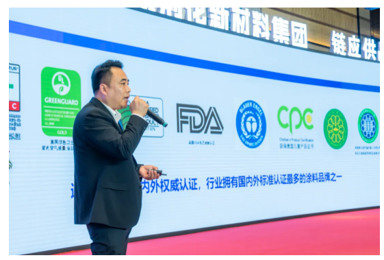 在下午的议程中,紫荆花新材料集团家具漆事业部销售副总监肖陈军做了“紫荆花开,紫荆花饰界革新”的主旨报告,系统介绍了紫荆花新材料集团发展历程、品牌优势、以及紫荆花深耕家具漆43年的技术和产品实力,并重点就紫荆花高定家具漆、紫荆花油改水系统落地方案等展开介绍。
