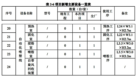 根据建设单位提供的资料,本次项目新增的设备包括1套自动化喷塑线,1套自动化喷塑固化室,1套自动化喷塑线喷粉室,1套自动化喷塑线浸粉室,1套自动化喷塑线自带旋风回收装置。