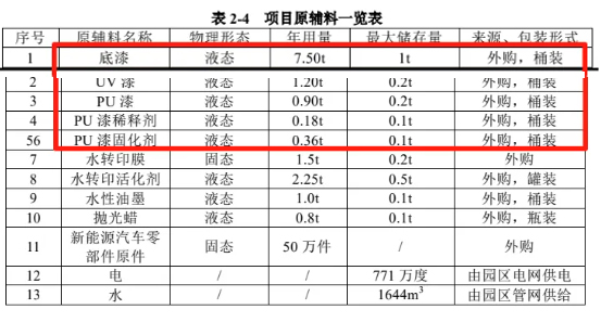 本项目年生产新能源汽车零部件50万件,新能源汽车零部件原料来源于贵州科远达汽车部件制造有限公司,所有零部件喷涂底漆后,约40%左右零部件直接外售,其余零部件再根据客户需求选择喷涂UV漆或者PU漆。根据经验剩余零部件中喷涂UV漆零部件占比约80%(24万件),喷涂PU漆零部件占比约20%(6万件),喷涂漆膜厚度在120至180微米之间,平均附着率约95%。