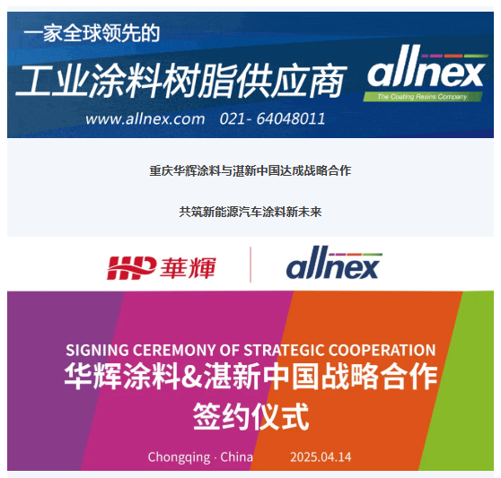 4月14日下午,重庆华辉涂料有限公司与全球领先的涂料树脂和助剂供应商湛新中国(allnex)在重庆正式签署战略合作协议,双方将围绕新能源汽车涂料领域展开深度技术合作,携手开启在技术协同、原材料采购、供应链整合等多个维度的深度战略合作。此次合作双方将共同推动高性能、高外观涂料树脂体系的创新研发,助力中国汽车涂料产业升级。