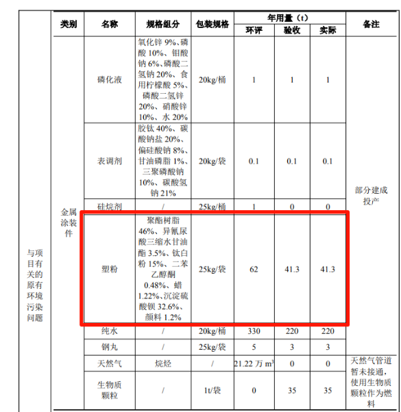 根据公开消息显示,该项目年用塑粉41.3吨,配备1台喷涂要机。
