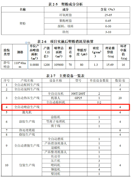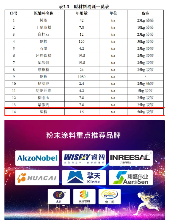 根据公开信息显示,该项目配备了4条全自动喷涂线,年消耗塑粉16吨,塑粉成分分析及消耗量核算情况如下表示所示: