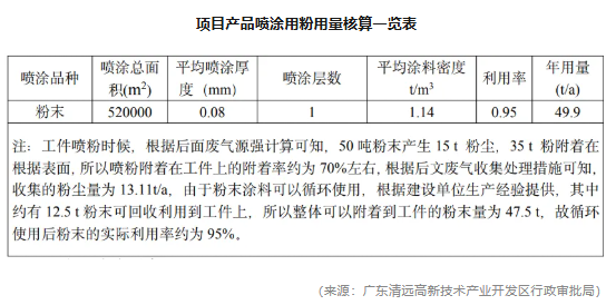 根据项目情况,项目根据客户需求对产品进行喷涂,根据建设单位提供的数据需要喷粉的工件约为400万件,投资1000万元,项目总喷涂面积约为520000m2.依据喷涂行业对油漆使用量的计算方法,计算得出项喷粉目用量约49.9吨/年,故本项目粉末原料50吨是合理的。