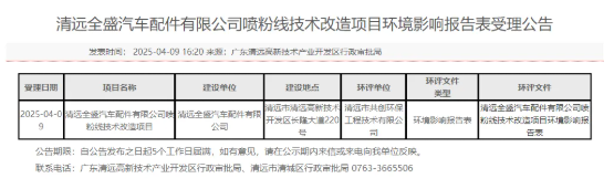 广东清远高新技术产业开发区行政审批局发布清远全盛汽车配件有限公司喷粉线技术改造项目环境影响报告表受理公告。