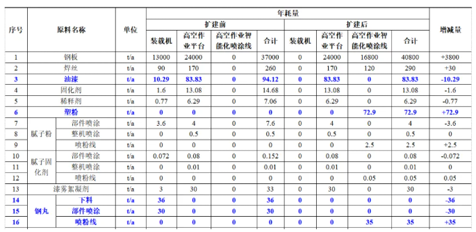 根据江苏柳工机械有限公司东部研发制造基地(高空作业平台)智能化喷涂线项目(一期)公示表来看,油漆的使用量减少了10.29吨/年,塑粉的用量增加72.9吨/年,同时增加35条喷粉线。