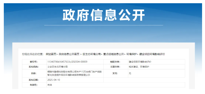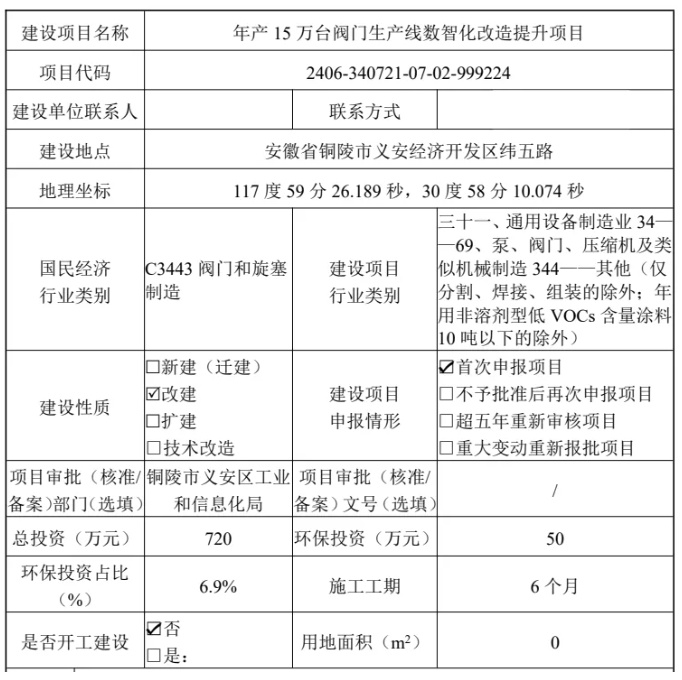 近日,义安区生态环境分局发布铜陵市肆得科技股份有限公司年产15万台阀门生产线数智化改造提升项目环境影响报告表受理公示。