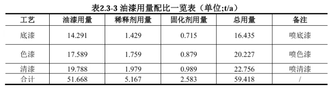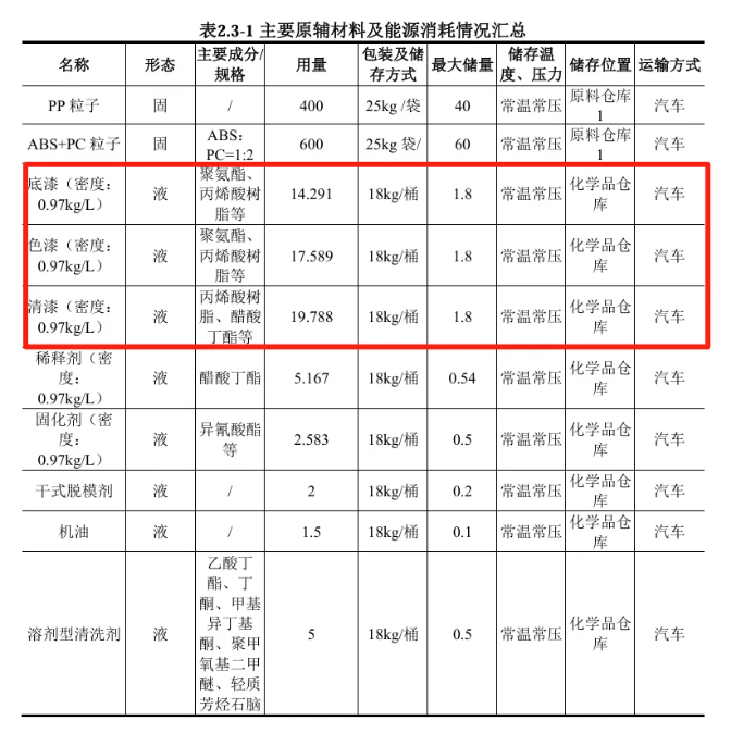 本项目色漆(施用状态下)符合《低挥发性有机化合物含量涂料产品技术 要求》(GB/T3859 7-2020)溶剂型涂料“车辆涂料-汽车原厂涂料-中漆”中含量限值不高于420克/升的要求。清漆:根据企业提供资料,清漆密度 0.97g/cm3.喷涂厚度 18μm,喷涂面积 510000平方米。根据《污染源源强核算技术指南 汽车制造》(HJ1097-2020),溶剂型涂料采用空气喷涂对零部件固体分附着率为45%,本项目喷漆附着率以45%计。 根据:附着量=喷涂面积×喷涂厚度×密度=510000×18×10 -6×0.97=8.905t则清漆用量=8.905t÷0.45=19.788t。
