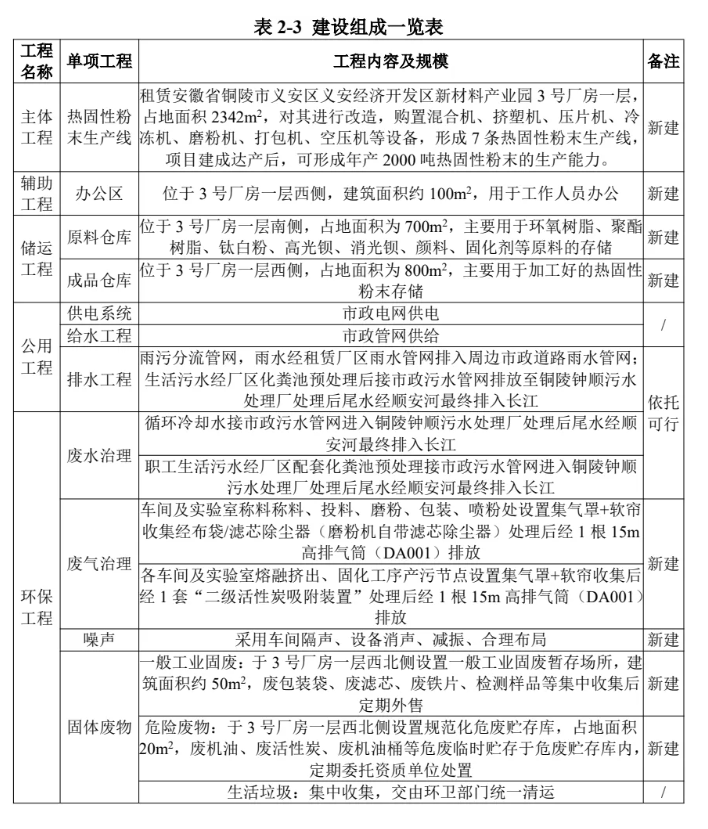 铜陵昶祥新材料科技有限公司拟于安徽省铜陵市义安区义安经济开发区新材料产业园建设年产2000吨新能源汽车、白色家电新材料项目(一期),系租赁铜陵金桥建设投资有限公司新材料产业园 3#厂房一层,占地面积 2342m2.对其进行改造,购置混合机、挤塑机、压片机、冷冻机、磨粉机、打包机、空压机等设备,项目建成达产后,可形成年产2000吨热固性粉末的生产能力。