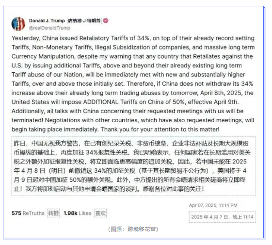 继对于全球发起“对等关税”后,特朗普再次重磅发声,“若中方不撤回加税措施,将于4月9日对中国加征额外50%关税”。商务部“隔空”喊话,称中方对此坚决反对。如果美方升级关税措施落地,中方将坚决采取反制措施维护自身权益。如果美方一意孤行,中方必将奉陪到底。