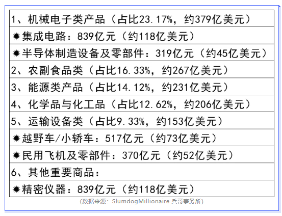 中国从美国进口的商品结构也较为多元,2024年中国对美国进口了总价值11640亿元人民币(折合约1435亿美元)的商品。农产品、能源、机械电子为三大核心进口领域。