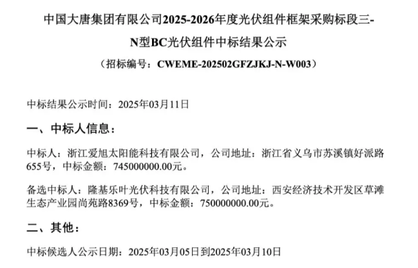 日前,大唐集团公示2025-2026年度光伏组件框架采购中标结果。爱旭凭借N型ABC组件的至高效率、可靠品质及创新技术等优势,以第一中标人身份成功中标“N型BC光伏组件”标段,标段容量为1GW,标志着爱旭国内集中式业务取得新的重大突破。