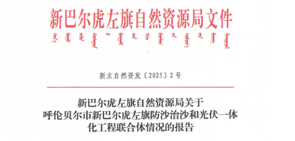 近日,内蒙古呼伦贝尔市新巴尔虎左旗自然资源局下发《关于呼伦贝尔市新巴尔虎左旗防沙治沙和光伏一体化工程联合体情况的报告》,报告指出:
