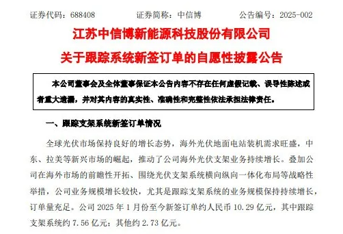 1月23日,中信博发布公告称,公司2025年1月份至今新签订单约人民币10.29亿元,其中跟踪支架系统约7.56亿元;其他约2.73亿元。