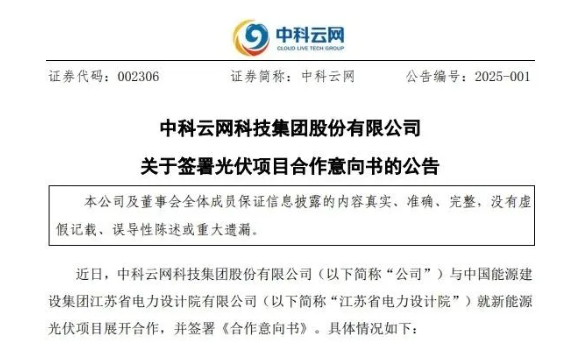 2025年1月2日,中科云网发布公告称,2024年12月30日,公司与江苏省电力设计院签署了《合作意向书》,就盐城光伏项目1GW组件招采事宜进行意向合作。