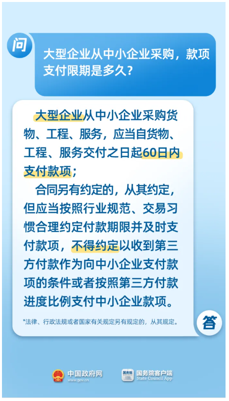 根据802号文件规定,机关、事业单位从中小企业采购货物、工程、服务,应当自货物、工程、服务交付之日起30日内支付款项,付款期限最长不得超过60日;大型企业从中小企业采购货物、工程、服务,应当自货物、工程、服务交付之日起60日内支付款项。