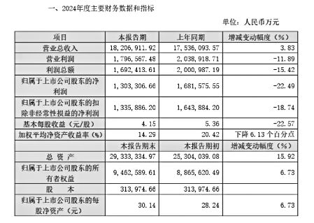 公告显示,截至报告期末,万华总资产为29.333.334.97万元,较期初增长15.92%;归属于上市公司股东的所有者权益为9.462.589.61万元,较期初增长6.73%。报告期内,该公司主要产品销量持续增长,但受市场价格和原料成本波动因素影响,整体毛利同比基本持平;科研投入持续增加,销售、管理、财务等三项费用同比增长;同时对部分投资项目计提资产减值准备或报废处理,2024年归属于上市公司股东的净利润比上年同期下降22.49%。